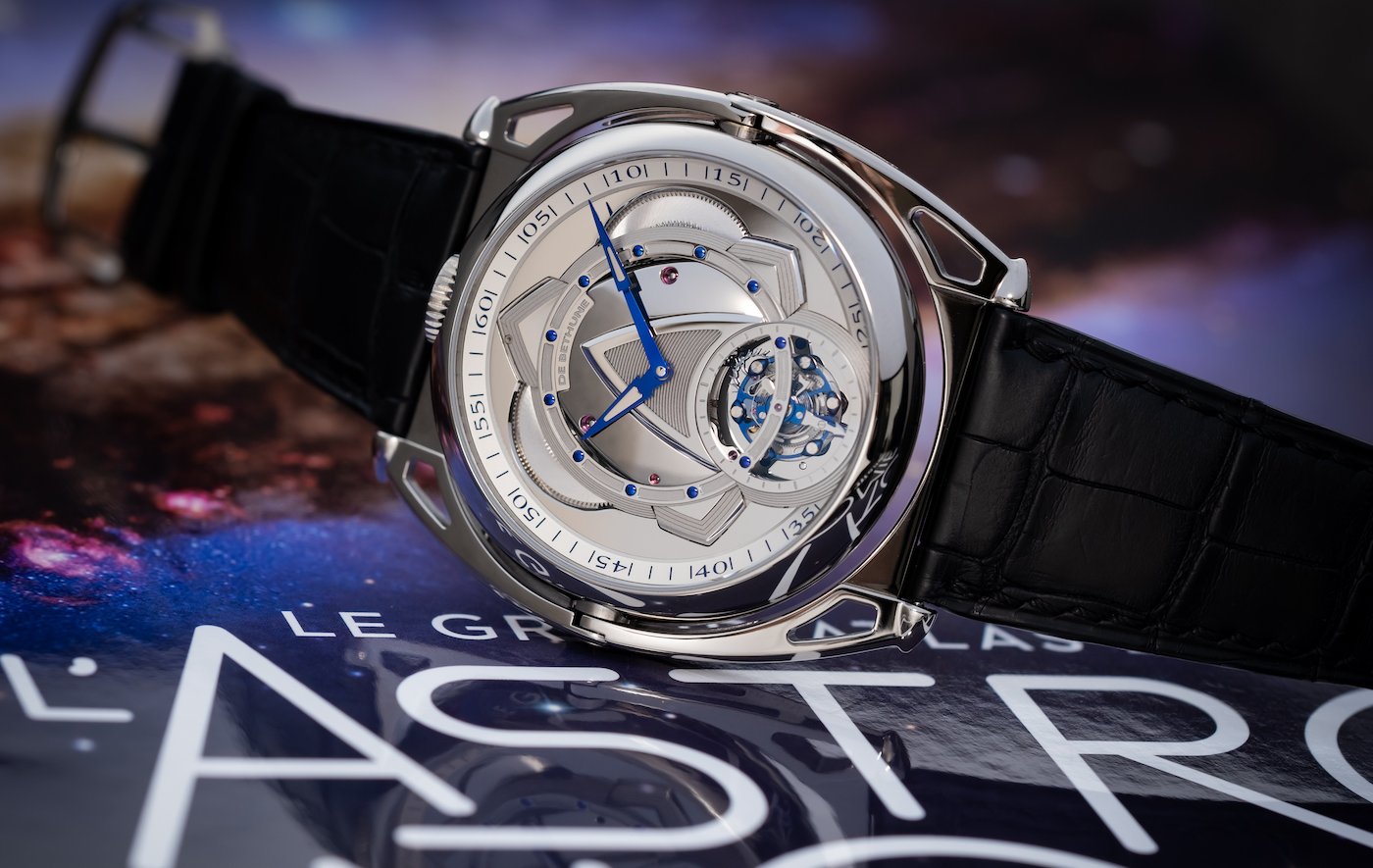 The first face is all modern design and elegance: central hours and minutes hands, titanium tourbillon and balance at 6 o’clock with a 30-second seconds display, and a perfectly symmetrical, delta-shaped bridge to provide angular support.
