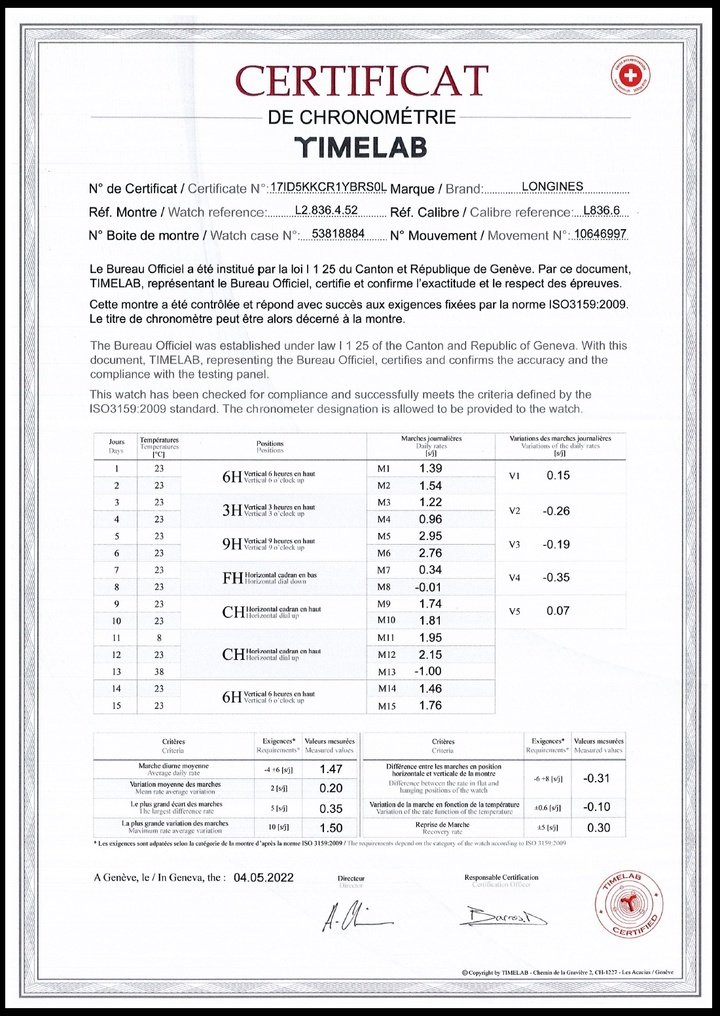 - According to this certificate delivered by Timelab, the watch’s average daily rate is 1.47 sec/day, while the generally accepted standard is -4/+6 sec/day. Another figure: while the largest acceptable difference rate is 5 sec/day, the calibre L836.6 has a very minimal 0.35 sec/ day variation. Similarly, the rate variation according to temperature, which has a standard variation of ±0.6 sec/day, is just -0.10 sec/day.