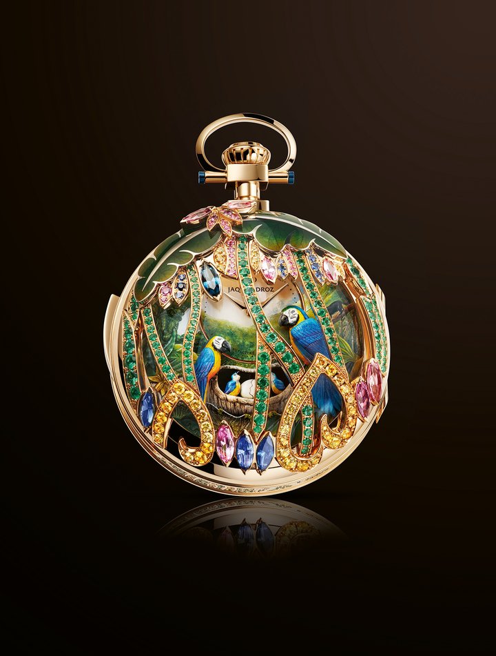 Housed in a 56mm red gold case, the movement features a minute repeater coupled with an automaton boasting eight animations, activated in concert by a single bolt mechanism at 9 o’clock. The scene comes to life as the waterfall in the background flows, the two parent parrots move, their egg hatches and their chicks shuffle. The scene, created entirely by hand by the artisans at Jaquet Droz, called for the very highest levels of craftsmanship: enamelling, engraving and micro-painting. The case has been entirely hand-set and hand-painted, both on the dial side and the back, and features a secret mechanism (for which two patents were filed) in an opening hidden within the bow. The watch has 1,240 hand-set jewels, including 486 emeralds, 727 sapphires and 16 rubies.