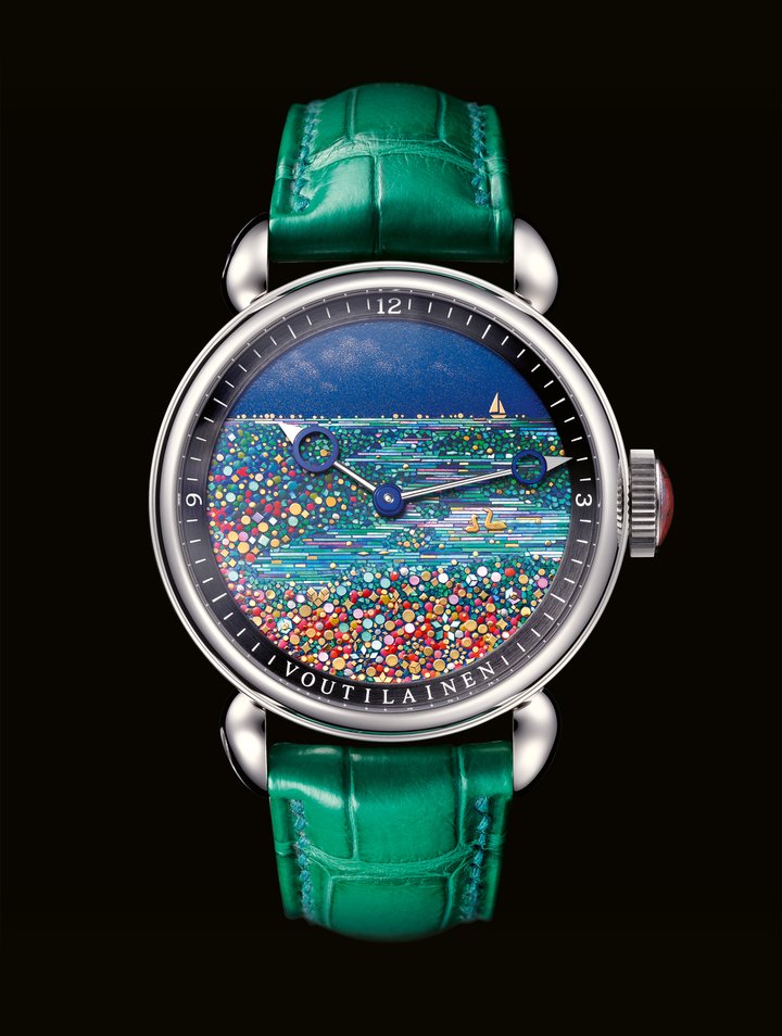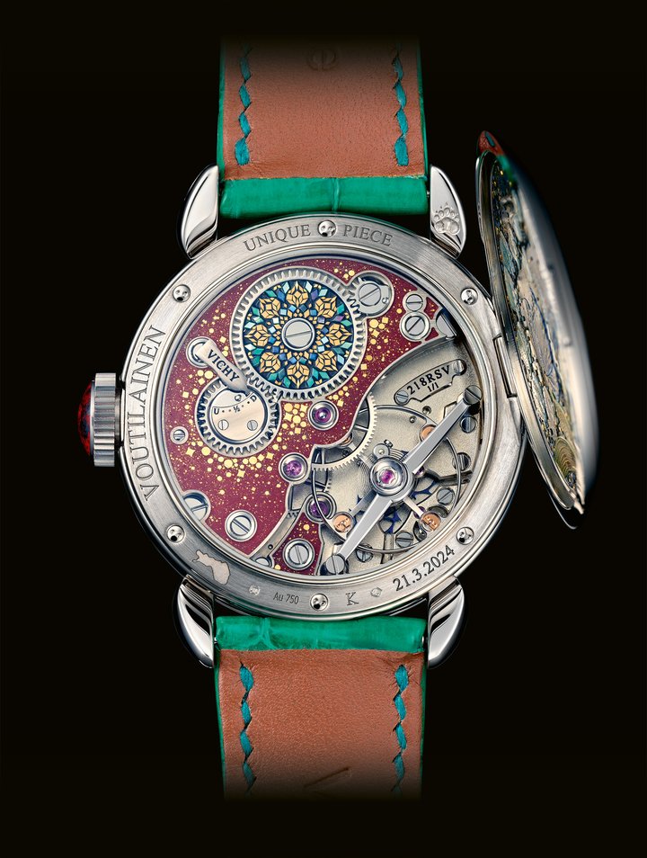 - Voutilainen 28 Kohan Unique Piece: where to begin when describing this watch, crafted at the request of a Finnish collector as the gift of a lifetime for his wife? Every inch of the decoration, on the dial, the case, the inside and outside of the cover and the movement itself, is how he asked for it to be. Depictions of Lake Saimaa adorn the dial, a Finnish autumn recreated in miniature. On the outside of the cover, two seven-spotted ladybirds, Finland’s national insect, have landed on a silver birch leaf (the country’s national tree). The inside is adorned with lily-of-the-valley, the national flower, and the country’s national butterfly, the holly blue, shown wings spread in search of nectar. An attentive eye will take in the wealth of detail inscribed on the white gold case, such as a tiny map of Finland, a bear’s pawmark (the Finnish national animal) and the lady’s birthday, as well as on the movement itself, with its richly decorated ratchet wheel and bridge… not forgetting an amusing reference to Madam’s favourite water, with a power-reserve indicator in the form of a Vichy mineral water bottle!