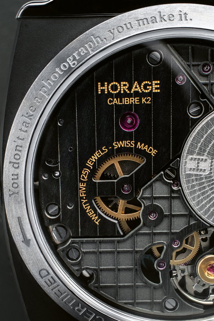 The brand’s engineers developed the hugely versatile HORAGE K2 calibre to make full use of silicon technology: you’ll find a full balance suite of pallet fork, hairspring and wheel made of this lightweight and low friction material. The micro-rotor design allows us to create a movement just 3.6mm thick. K2-equipped timepieces are COSC-certified to -4/+6 seconds per day and boast an impressive +72 hour power reserve despite their svelte dimensions.