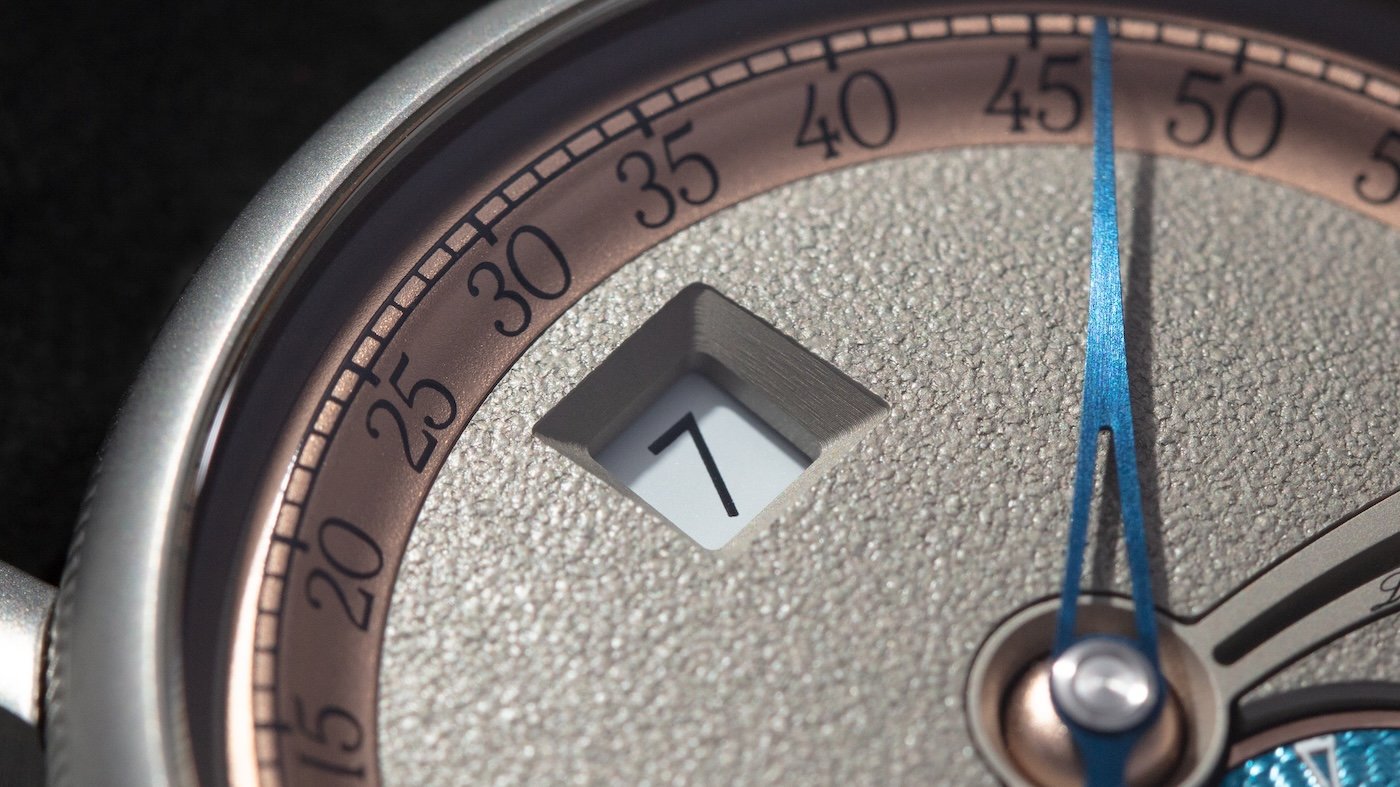 Hovering above this surface is the distinctive Delphis display. At 12 o’clock, the jumping hour advances instantly at the top of each hour. At the center, the retrograde minute hand sweeps across the curved scale before snapping back to its starting position. At the lower part of the dial, the small seconds rotate continuously.