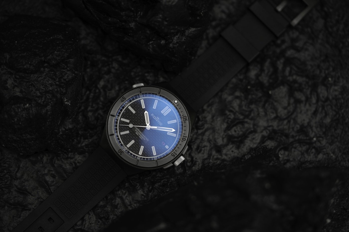 t the core of the new Fortis Marinemaster M-44 DLC Gravity Black and Black Resin is the case: a solid block of stainless steel, coated with the brand’s Dianoir® DLC finish.