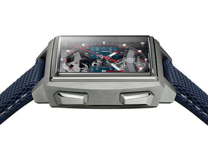 The 40mm grade 5 titanium case has also been reworked. Tapered profiles create a sense of slimness, while angular facets along the sides give the watch a strong architectural presence, almost brutalist in character. The square sapphire caseback offers a full view of the movement, specifically designed to fit within the Monaco’s iconic architecture.