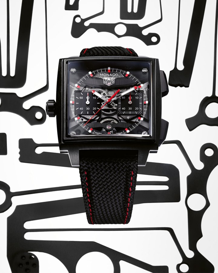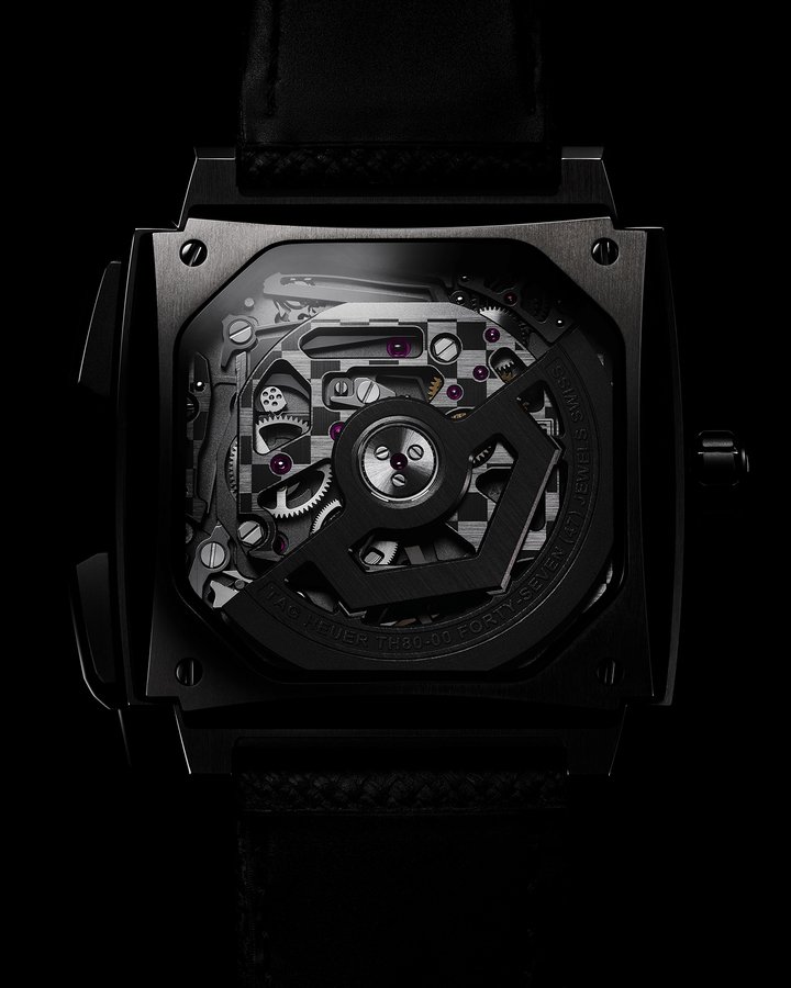 Accordingly, a transparent central dial reveals the barrel, gear train, TH-Carbonspring oscillator and escapement. On the reverse side, the watch reprises certain aesthetic codes introduced with Calibre TH81-00 of the TAG Heuer Monaco Split-Seconds, notably the signature chequered-flag pattern and the shield-shaped oscillating weight.