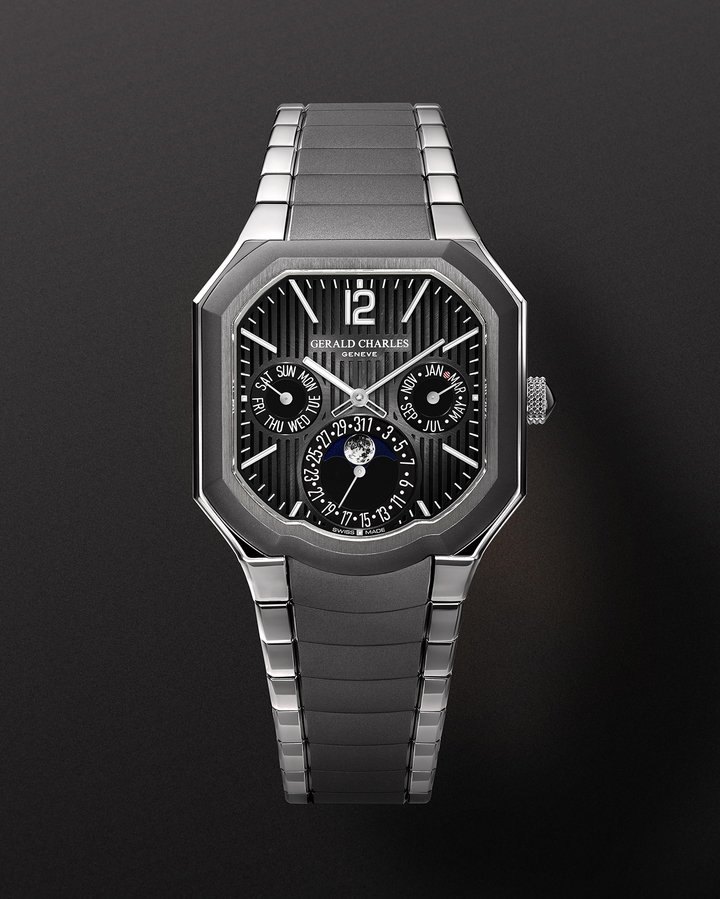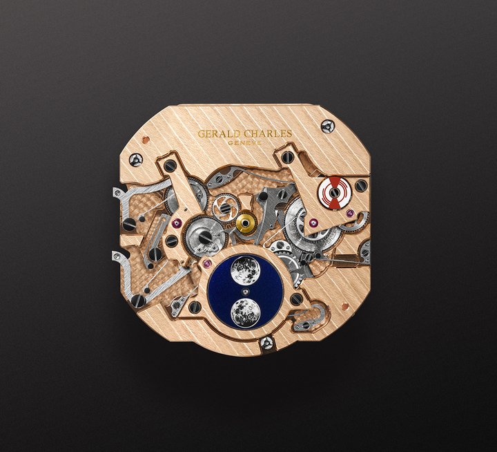 Those three counters show the day, date, month, phases of the moon and leap year. These are mechanically programmed to account for month lengths, even in a leap year, for more than 100 years. Indications are fuelled by calibre GCA11000, an automatic movement wound by a golden micro-rotor that offers a power reserve of 50 hours. This new calibre also becomes a platform for future Gerald Charles watchmaking innovations.
