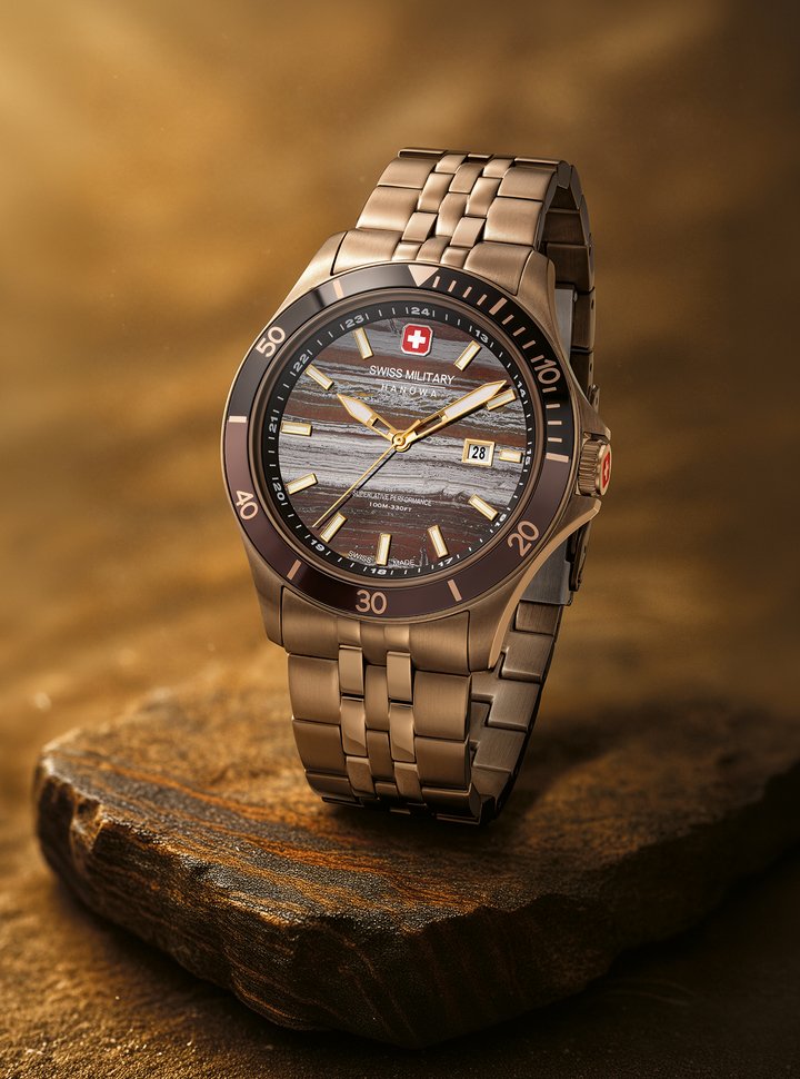he 42mm stainless steel case is finished in a warm beige-gold, perfectly complemented by a distinctive split-tone top ring in black and brown. Protected by flat sapphire glass, a Swiss-made quartz movement provides impeccable reliability.