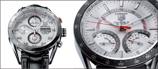 Powered by the exclusive Calibre S movement – an electro-mechanical mechanism designed, patented and manufactured by TAG Heuer – this chronograph measures and displays 1/100th of a second, gives direct access to best time and corresponding lap number, and records times for up to 20 laps. Three hand-applied semi-circular counters on a black or silver dial with spiral effect and "Calibre S” and “Laptimer Retrograde” inscriptions; polished 43mm stainless-steel case; fixed black aluminum bezel with tachymeter scale; red second hand; luminescent markers on the red-tipped counter hands and the indexes; polished pushbutton crown with black varnish on the face; hand-applied TAG Heuer logo; and a choice of a 5-row fine-brushed and polished steel bracelet or a stylish black perforated rubber strap. Water resistant to 100 metres and equipped with a perpetual “retrograde” calendar until 2099.