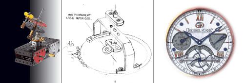 18 carat red or white gold, or platinum case (43.5 x 15.76) equipped with a hand-winding Calibre GF 02 Movement, with double tourbillon 30°: exterior tourbillon rotating cycle of 4 minutes, interior tourbillon rotating cycle of 1 minute. 72-hour power reserve indicator, rapid rotating twin barrels (1 turn in 3.2 hours) one of which is equipped with a slipping spring so as to avoid excess tension, free sprung balance wheel with white gold mean-time screws (10mm diameter), 21,600 v.p.h., frosted nickel silver bridges, finished in ‘jade gold’. Hours and minutes indications, small seconds and rotating cycle of 1 minute on subsidiary dial at 9 o’clock, indicator of exterior tourbillon rotation cycle of 4 minutes at 6 o’clock, sectorial power reserve indicator decentred at 3 o’clock, convex sapphire crystal front and back, black or brown alligator strap with folding clasp, water-resistant to 30 metres.