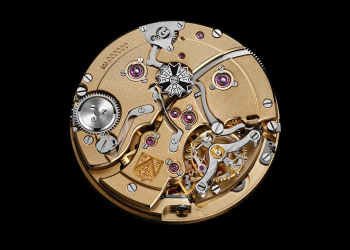 Double barrels set below two screwed golden chatons enable a minimum 7-day power reserve, indicated by the display on the dial at 9 o’clock.