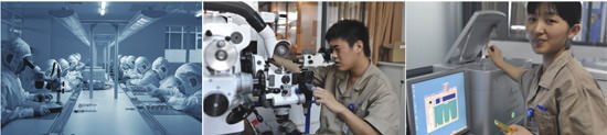 Attaching the sapphire crystals to a watch in the Gold collection, setting topaz on a model from the Kana brand and Tao Li, General Manager, with members of the management team. (Photo D.R.)
