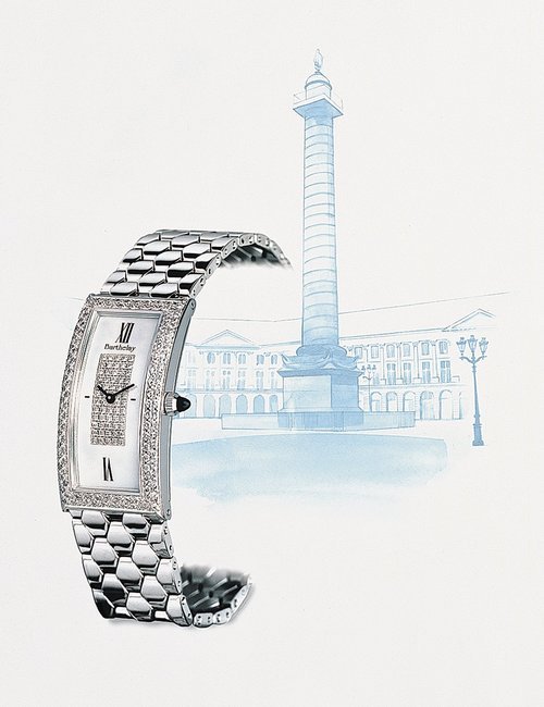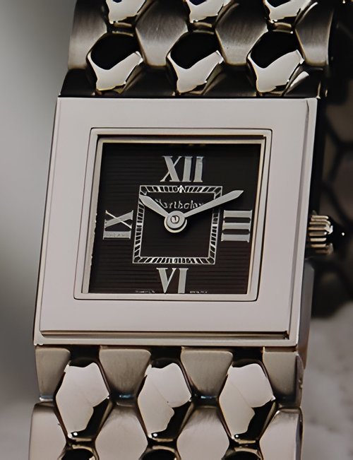 The hallmarks of this new creation by Barthelay are its strength and originality. The steel version presented here has Roman numerals in relief on the bezel and comes on the brand’s famous honeycomb bracelet. There is a generous choice of versions: gold bezel paved with brilliants, various colours of mother-of-pearl or enamel for the dial, and a rubber strap.