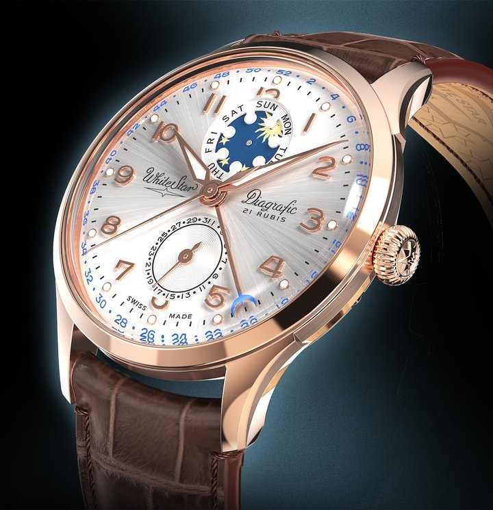 - With its midnight blue dial, studded with twinkling stars, and its crown at 2 o’clock, the White Star Unigrafic is the brand’s dress watch.