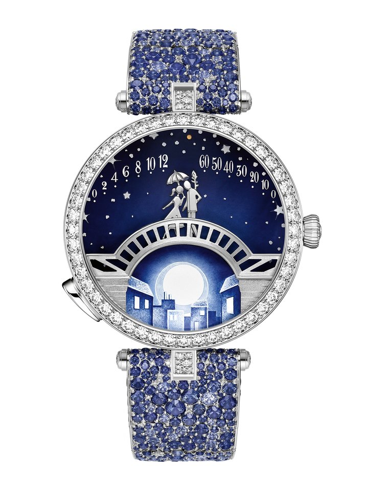 - This year, four new watches with precious bracelets enrich the Lady Arpels Pont des Amoureux story, revealing the couple in landscape scenes evoking different moments of the day. In turn, the dials take on colour nuances of dawn, morning, dusk and moonlight.
