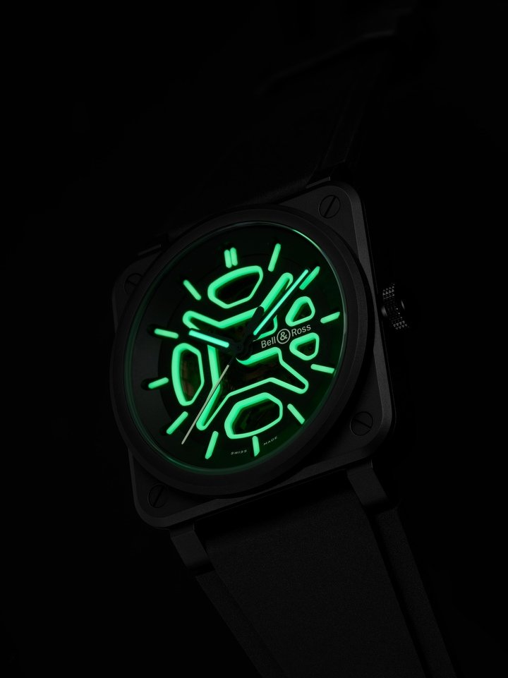 - Designed for the 20th anniversary of the first square Bell & Ross watch, the BR-03 Skeleton comes as three complementary versions - Black Ceramic, Lum Ceramic and Grey Steel - that showcase the brand’s expertise in skeletonisation and luminescence.