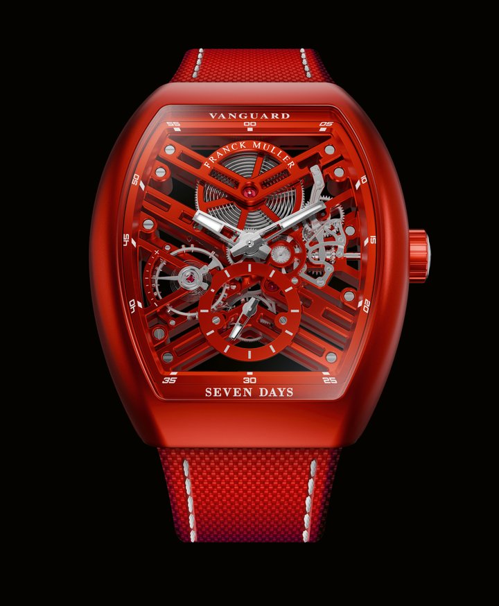 The Vanguard Royal Bauxite collection is a showcase for Frank Muller’s expertise when working with ultra-light aluminium. A skeletonised architecture reveals the regulating organ at 8 o’clock, the mainspring barrel that supplies the seven-day power reserve at 12 o’clock, and the winding mechanism at 3 o’clock. Light on the wrist, complex to create, the Vanguard Royal Bauxite comes in multiple vibrant colours.