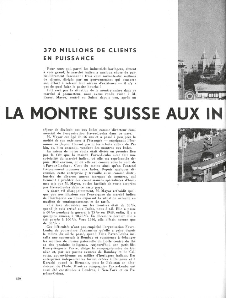 India’s promise... in 1957, in this archive extract from the Journal Suisse d’Horlogerie. Ernest Mayor, Favre Leuba’s sales director in the country, reports on the very high taxes on watch imports (100% that year). Nearly 70 years later, a free trade agreement is opening up new prospects.