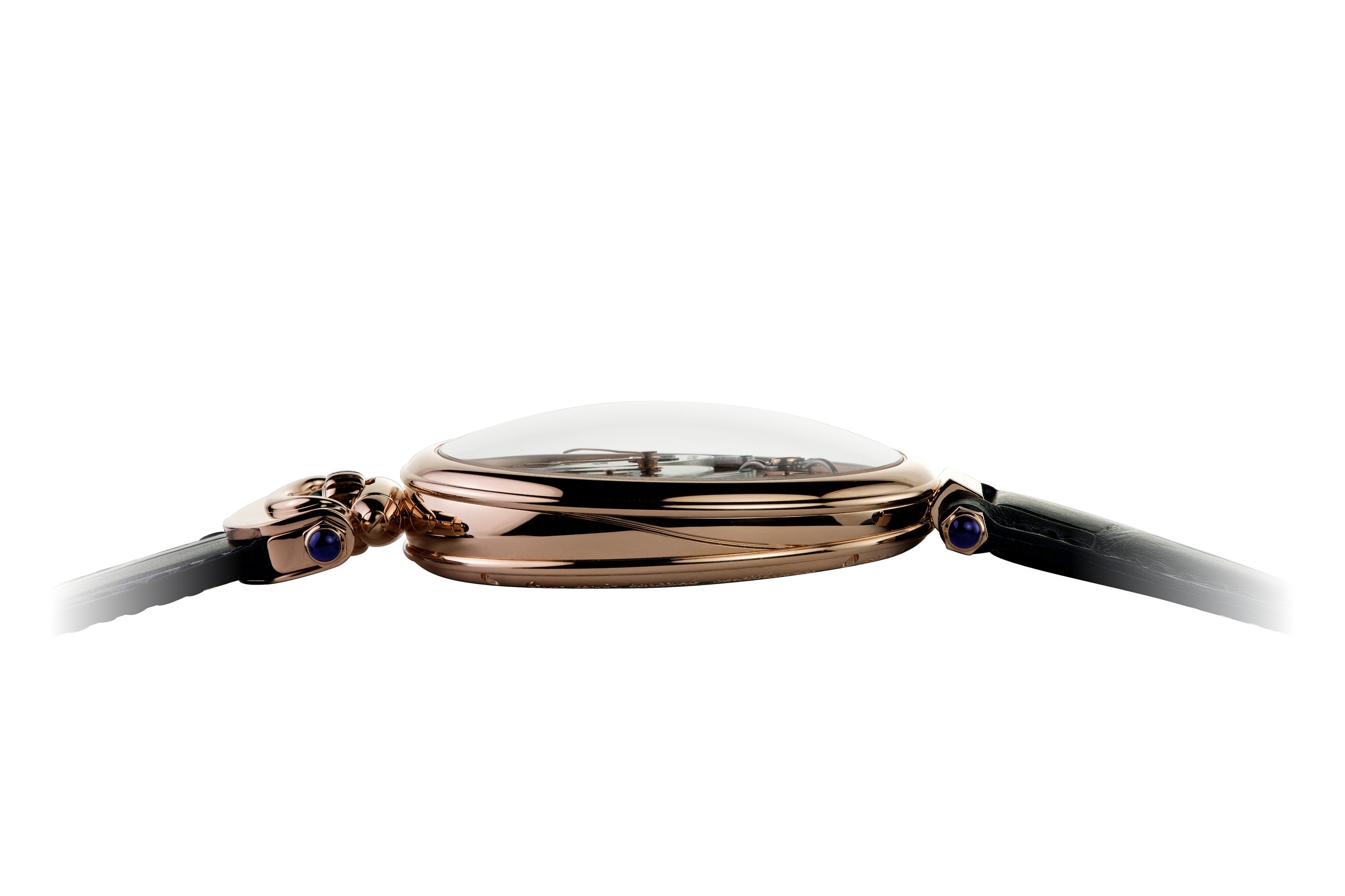 he Virtuoso VIII elegantly blends Bovet’s two iconic cases, the Fleurier and the Dimier since it is the first timepiece in the Fleurier collection to feature an inclined crystal aperture on the 12-6 o’clock axis. This innovative concept offers a new perspective on the caliber’s architecture, decoration, and function displays.