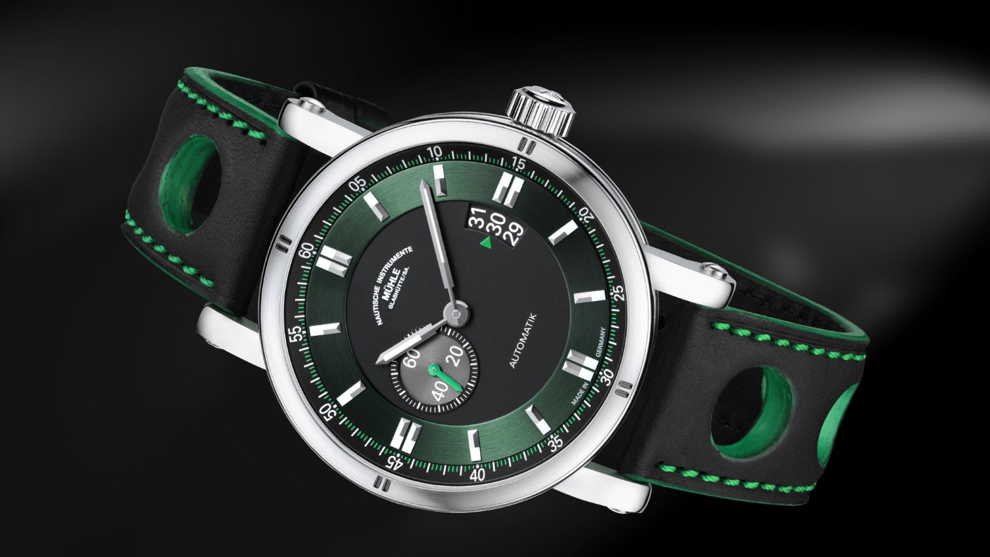 In contrast, the wearers of the new Teutonia Sport II in British racing green have nothing to worry about on a rainy day. This Mühle watch is not only inspired by the sporty design and traditional colours of the British roadsters but also goes one step further by combining these characteristics with Mühle-Glashütte’s nautical values: precision, robustness and excellent readability. The high-quality case of the Teutonia Sport II keeps the rain out with its design that is water-resistant up to a pressure of 10 bars. It also reliably protects both the precise engine of the automatic watch and its sophisticated instrument panel.