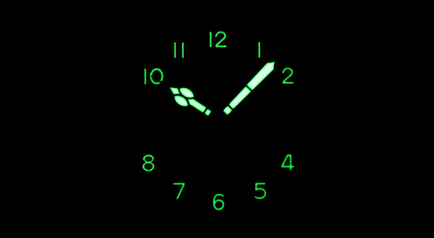 The hands and numerals of the limited Pioneer Mk II 80 Jahre Jubilaeum are coated with Super-LumiNova® greenline C1. This ensures optimal readability at day and night time.