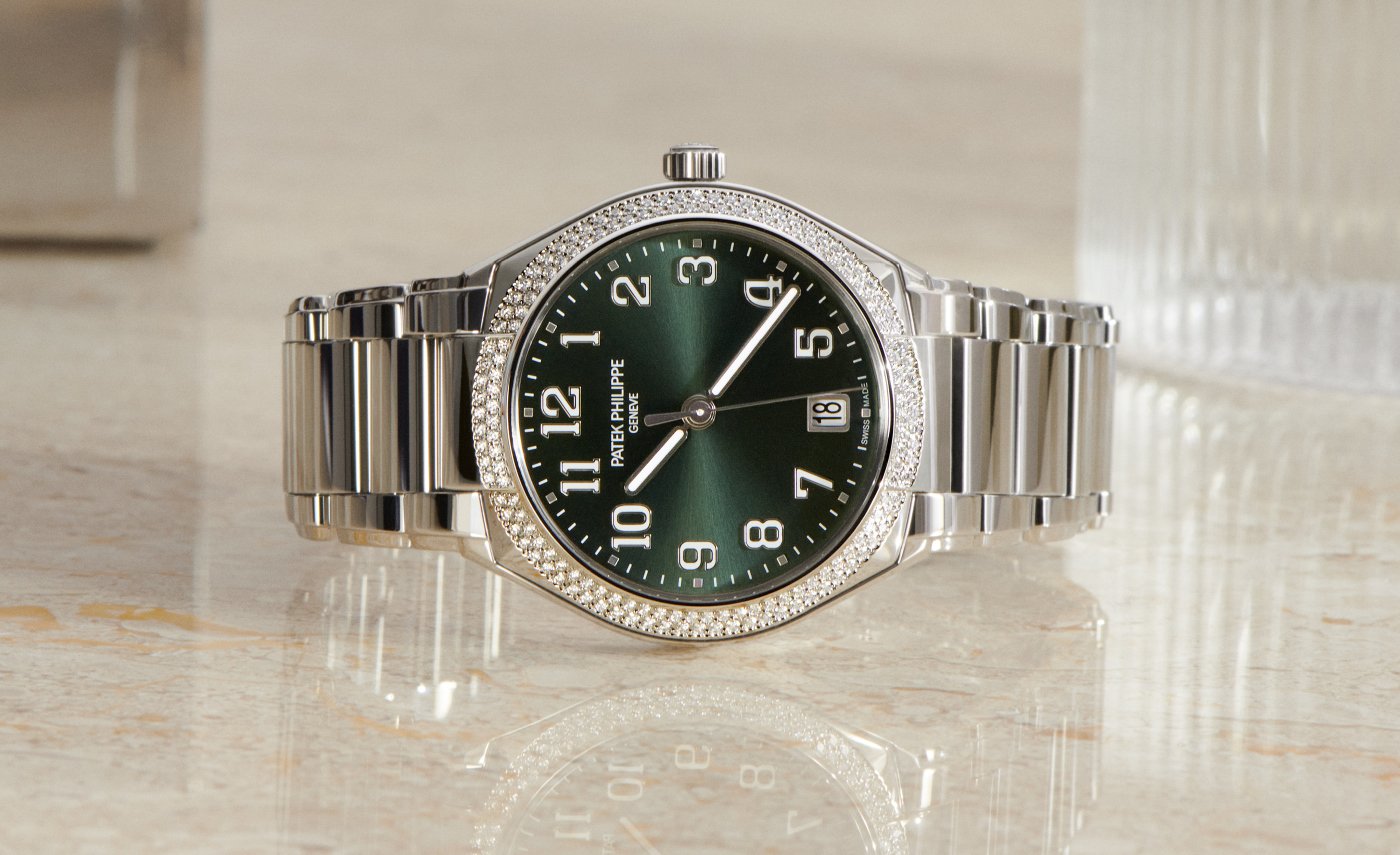 This new Twenty~4 Automatic in steel stands out by its elegant dial in olive green, a color making its first appearance in the contemporary Patek Philippe collections and presented to great effect with a glowing sunburst decoration. The white-gold applied Arabic numerals and white-gold hands have a luminescent coating, ensuring excellent legibility under all conditions. A white-gold frame adorns the date aperture at 6 o’clock. The pure circle of the case is lit with 160 diamonds ( 0.77 carat) set in two staggered rows according to the “dentelle” (lacework) technique.